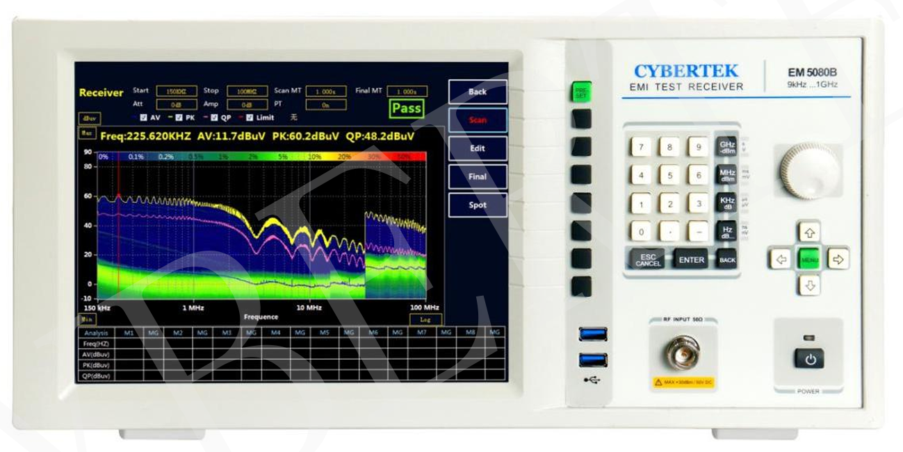 EM5080 系列接收機是全數位化預認證級時域接收機,完全符合 CISPR16-1-1標準。采用即時分析技術平台,利用強大的 PC平台超算能力對寬帶信號進行實時高速 FFT 分析計算,實時帶寬高達 10MHz,能夠以極快的速度進行電磁騷擾測量,EM5080系列采用時域掃描比傳統的逐點掃描接收機快 500倍以上,過去需要幾個小時的騷擾測量現在僅需幾秒鐘即可極速完成,在產品的開發和產品認證期間可以節省大量的時間和成本,而且該系列產品也保留了傳統接收機的步進掃描方式,給用戶更多的選擇;同時具有實時頻譜分析功能;采用 10.4英寸高清大屏幕顯示,清晰的結構化菜單,非常方便使用;易於升級維護;數字時域接收機具有掃描速度快,精度高和穩定性好等優點。