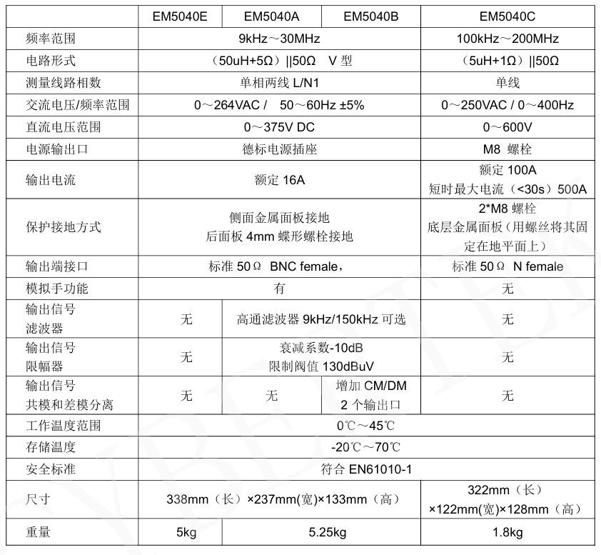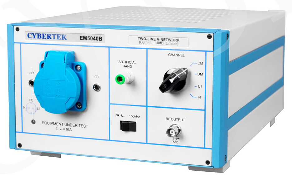 EM5040E/5040A/5040B 人工電源網絡是一款(50uH+5Ω)||50Ω V型 LISN(LineImpedanceStableNetwork)。該產品能在9kHz—30MHz射頻範圍內為被測試設備端子和參考地之間提供穩定的阻抗,同時又將來自電網的無用信號與測量電路隔離開,僅將被測試設備的幹擾電壓耦合到測量接收機的輸入端。該產品的性能符合CISPR16-1-2:2006標準要求,適用於單相設備傳導騷擾電壓測量。標準的BNC輸出接口和50 歐姆輸出阻抗,可匹配任何廠家的接收機、頻譜儀等測量設備;產品自帶模擬手功能,可模擬手持式設備測量。