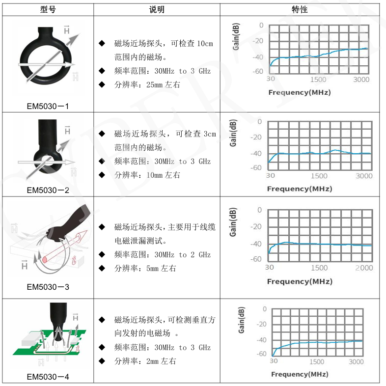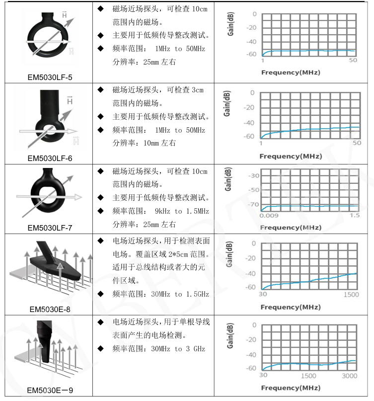 EM5030LF的頻率範圍是9kHz-50MHz,共3種探頭形狀。